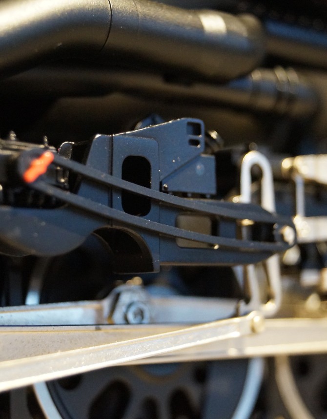 Die maßstäbliche Kupplungsattrappe im Kuhfänger kann nach dem Öffnen der beiden kleinen "Türen" wie beim Vorbild ausgeklappt werden. Die Rauchkammer kann ebenfalls geöffnet werden.
