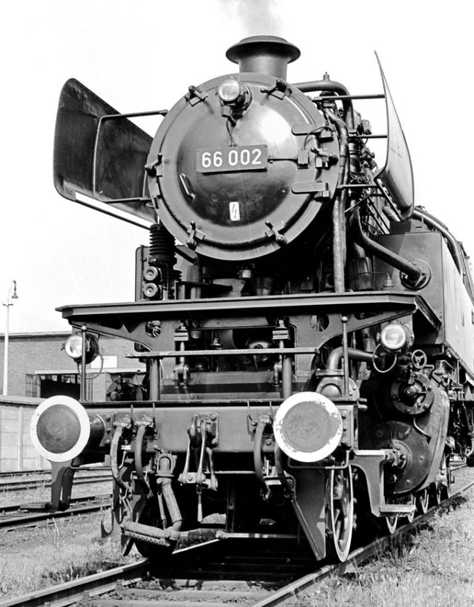 Die neue (noch nicht abgenommene) 66 002 im Oktober 1955 im Bw Frankfurt-Griesheim.